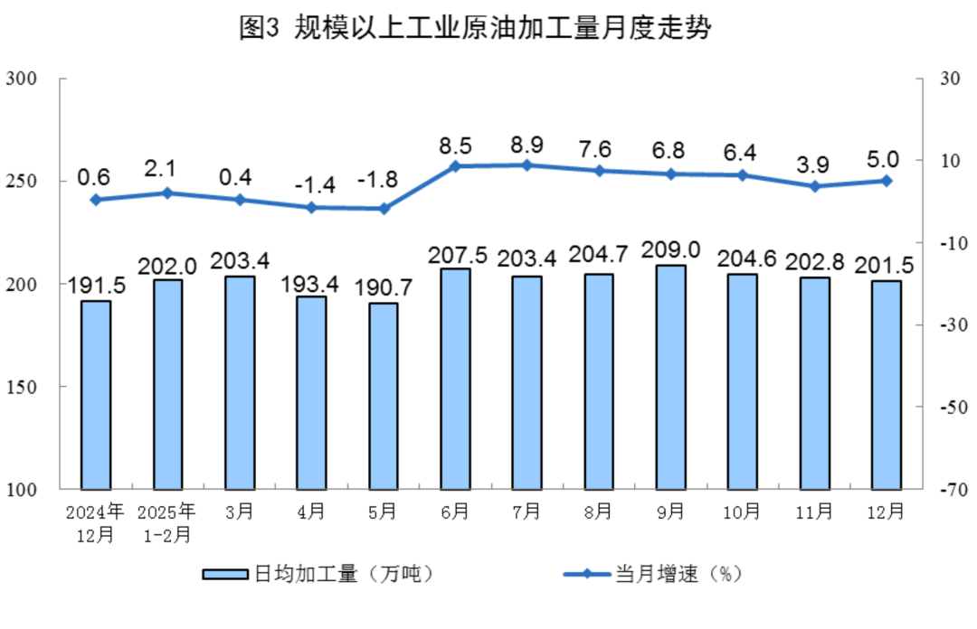 原油加工增速加快。12月份●,规上工业原油加工量6246万吨,同比增长5.0%●,增速比11月份加快1◇….1个百分点;日均加工量201.5万吨。