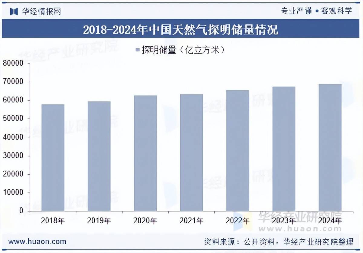 随着我国天然气勘探技术的进步以及国家对天然气勘查投资的不断加大,近年来,新增天然气探明储量持续增加,数据显示,2023年中国天然气探明储量达67424.5亿立方米,2024年国内天然气储量在68825.7亿立方米左右。