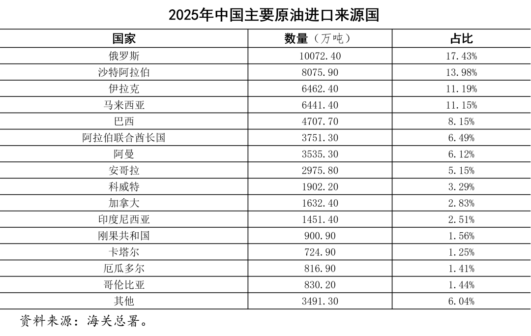 2025年,我国的原油进口来源国计49个,前10大进口来源国分别为俄罗斯、沙特阿拉伯、伊拉克、马来西亚、巴西、阿拉伯联合酋长国、阿曼、安哥拉、科威特和加拿大,占我国当年原油进口总量的85.78%,其中俄罗斯第一,数量为1.007亿吨,占比17.43%;沙特阿拉伯第二,数量为8075.9万吨,占比13.98%;伊拉克第三,数量为6462.4万吨,占比11.19%;马来西亚第四,数量为6441.4万吨,占比11.15%。